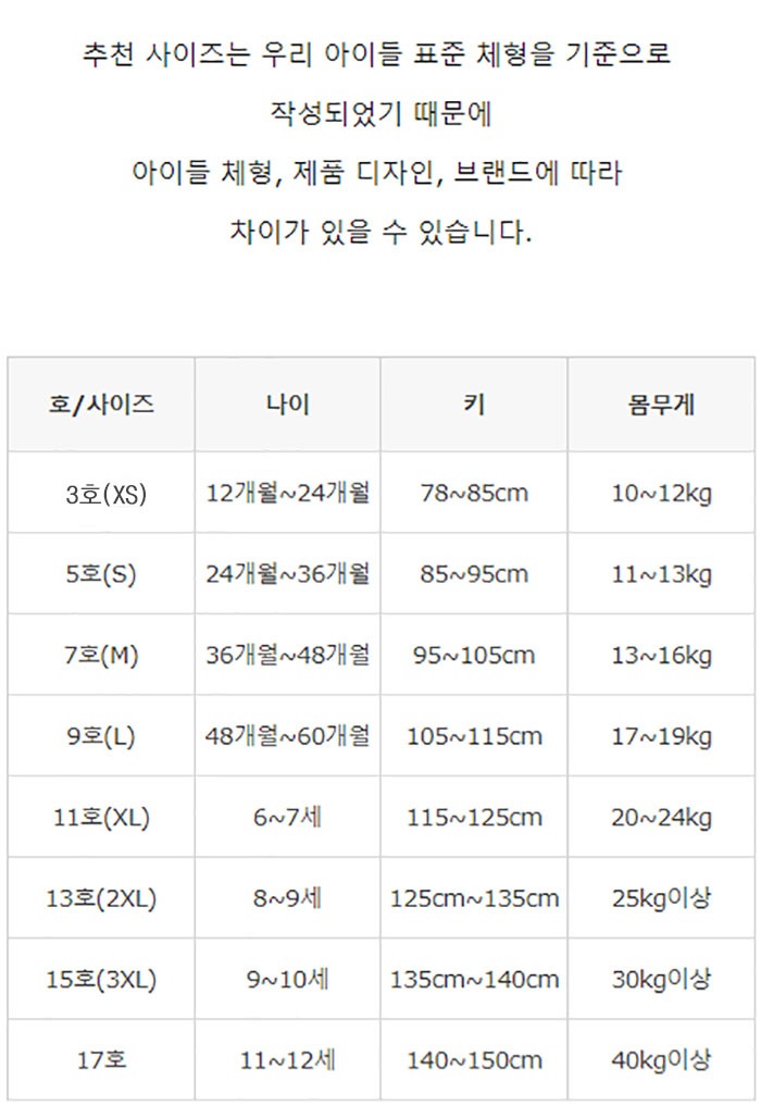 추천사이즈 보다는 우리아이 평소 입히시는 옷의 사이즈와